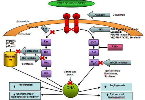 Further understanding of gliomagenesis has permitted the evaluation of targeted agents to inhibit specific signaling pathways. Targets have included growth factor receptors such as PDGFR and EGFR, Raf and the mammalian target of rapamycin (mTOR). Other targets have included the vascular endothelial growth factor and its receptor (VEGF and VEGFR) as well as intrinsic components of DNA structure (see Figure 3). We will highlight those at the forefront in translational research and those already used in practice.
