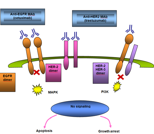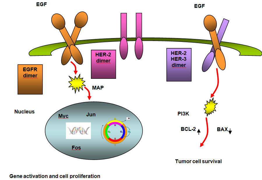 The epidermal growth factor receptor (EGFR) is the first member of a structurally similar group of receptors known as the erbB receptor family. There are four members in this family, including EGFR/HER−1 (c−erbB1), HER−2 (c−erbB2), HER−3 (c−erbB3) and HER−4 (c−erbB4). These receptors function as heterodimers if more than one receptor type is present. Growth factor− receptor binding causes dimerization and autophosphorylation on tyrosine residues (see Figure 6 parts A and B).